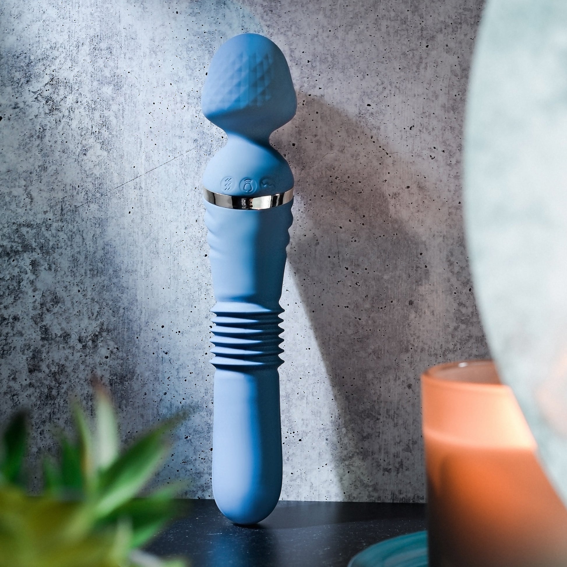 Feel double the excitement with two powerful toys in one! On one side, a diamond-textured wand head delivers 8 pulse-pounding vibration functions right to your clit. Flip it around to feel its 3-speed thrusting and 8-function vibrating shaft pump deep inside you. Ride the thrusts plus vibrations to intense G-gasms, let the wand drive your hot button totally wild, or switch back and forth until you go over the edge. Clean up with Adam & Eve toy cleaner and a warm water rinse.