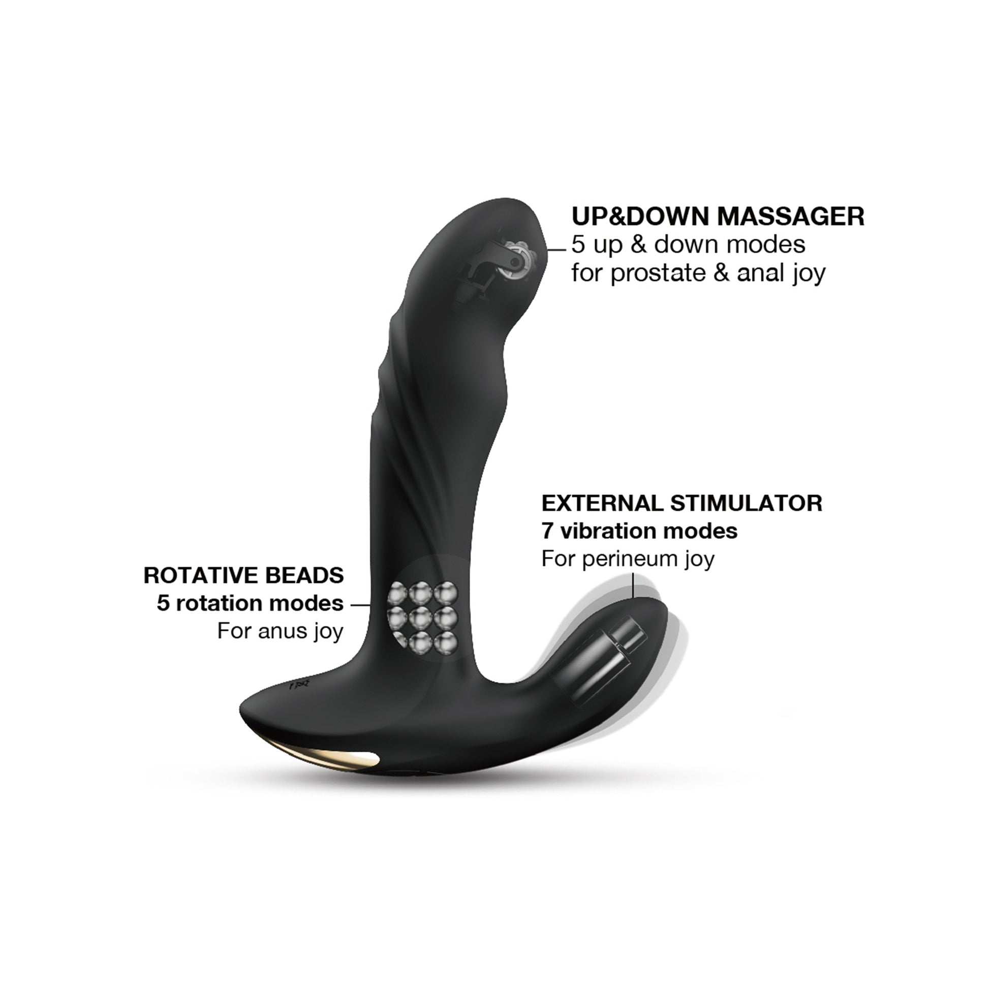 - 3-in-1 prostate massager : 1. 5 up & down modes for prostate & anal joy 2. 5 rotation modes for anus joy 3. 7 vibration modes for perineum joy