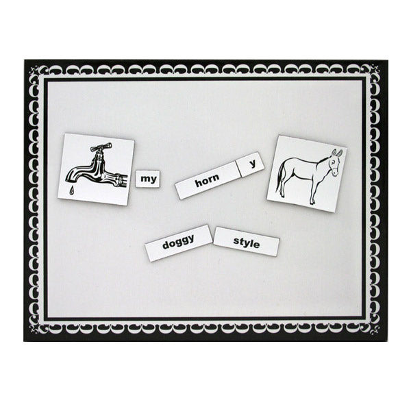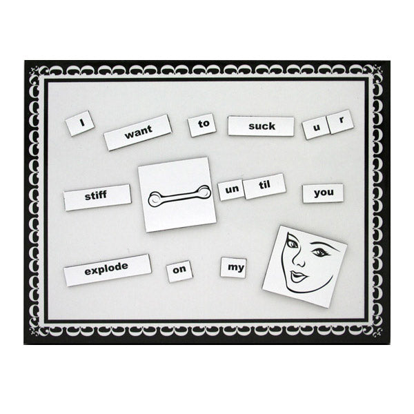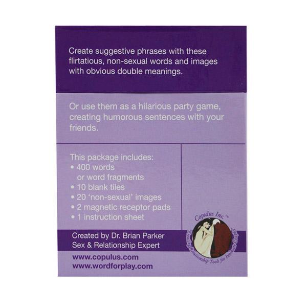 Create suggestive phrases with these flirtatious, non-sexual magnetic words and images with obvious double meanings. Or use them as a hilarious party game, creating humorous sentences with your friends. A fun and sexy way for couples to leave messages for one another. "Come on Lines" includes 400 non-sexual word and word fragment tiles and 20 images with countless sexual meanings. Each set also comes with 2 magnetic receptor pads which allow couples to leave messages privately. This game includes: 400 magnetic words or word fragments. 10 blank word tiles. 20 'non-sexual' images. 2 magnetic receptor pads. 1 instruction sheet.