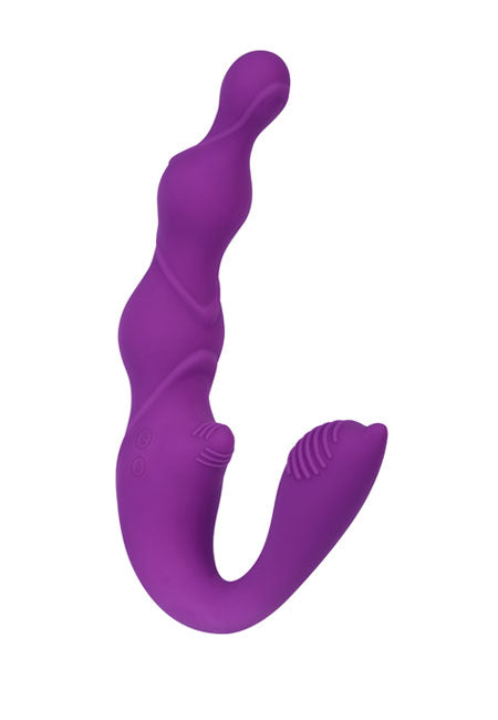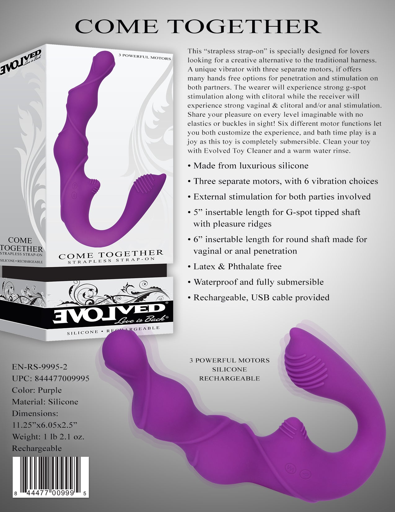 Evolved Come Together Vibrator, this “strapless strap-on” is specially designed for lesbian lovers looking for a creative alternative to the traditional harness. A unique dual vibrator with three separate motors, it offers many hands-free options for penetration and stimulation of all three major erogenous zones, with separate clitoral motor, ribbed G-spot tip, and graduated anal options.