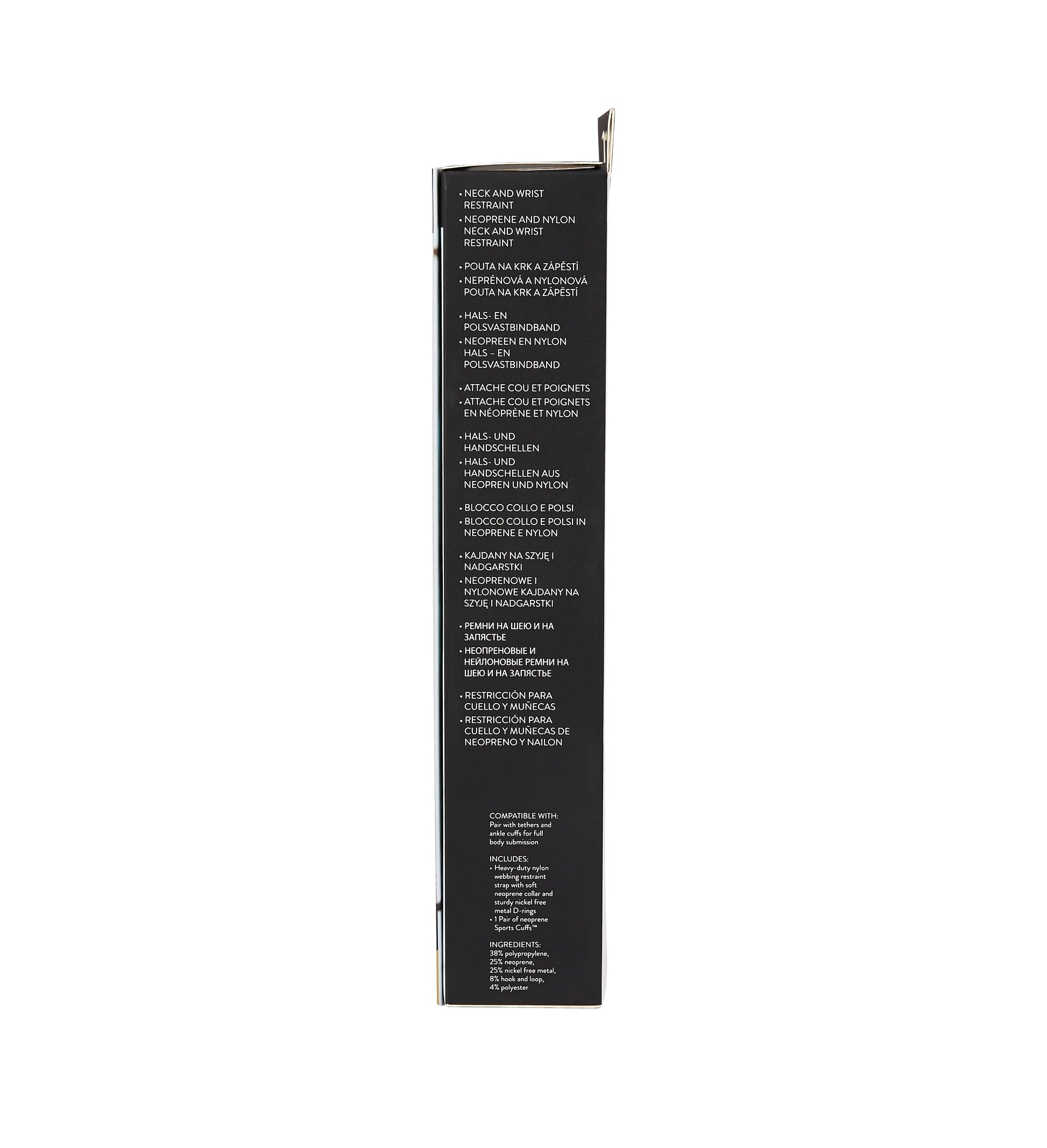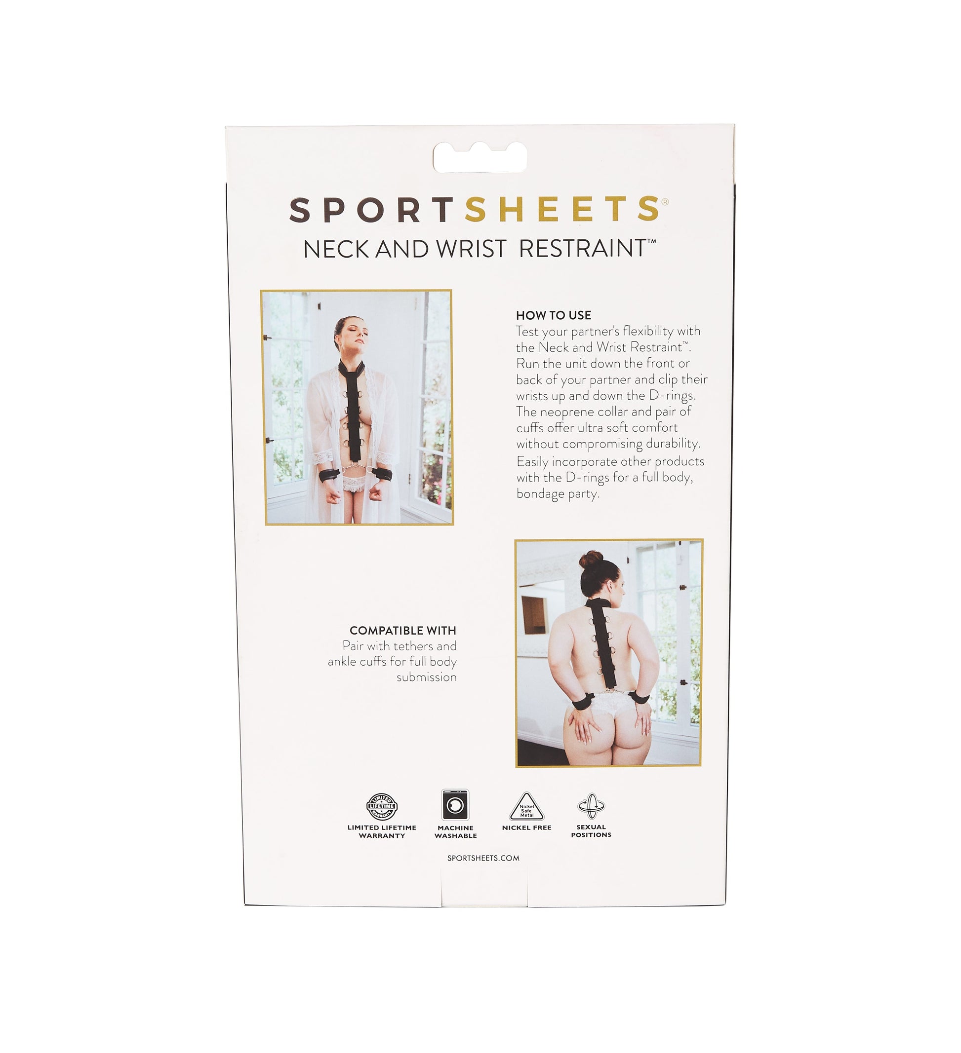 Create your own personal body restraint system. Test your partner's flexibility with the Neck and Wrist Restraint. Run the unit down the front or back of your partner and clip their wrists up and down the D-rings. The neoprene collar and pair of cuffs offer ultra soft comfort without compromising durability. Easily incorporate other products with the D-rings for a full body, bondage party.